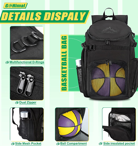 【Large Size】GoHimal basketball backpack size is 20inch x 12.8inch x 7.9inch, Capacity of 40L.【Ball Compartment】The independent grid zipper Ball Compartment can easily put basketball, soccer, volleyball, and rugby, which is easy for you to take.【Multiple Pocket】Equipped with mesh side pockets, insulated side pocket, and a big main pocket With Compartment, padded laptop/tablet sleeve with a security strap. Great for your sports accessories.