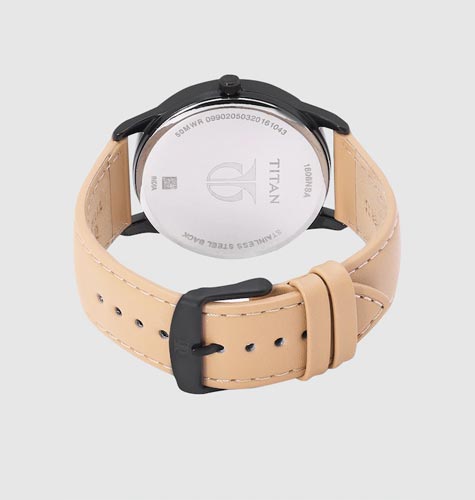 Display: AnalogueMovement: QuartzPower source: BatteryDial style: Solid round metal dialFeatures: Reset Time, Date ApertureStrap style: Brown regular, leather strap with a tang closureWater resistance: 50 mComes in a signature Titan caseGuarantee: 2 yearsGuarantee provided by brand/ manufacture