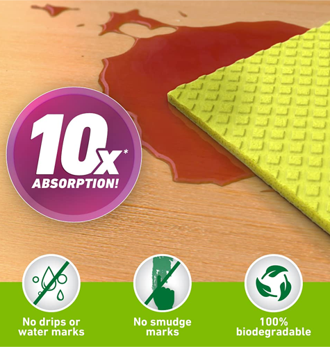 Single swipe clean for a mess free kitchenThe cellulose based sponge cleans any mess in a single swipeAbsorbs water 10 times its own weightDoes not leave behind any water marks while swipingCompletely lint free and 100% scratch free cleaning